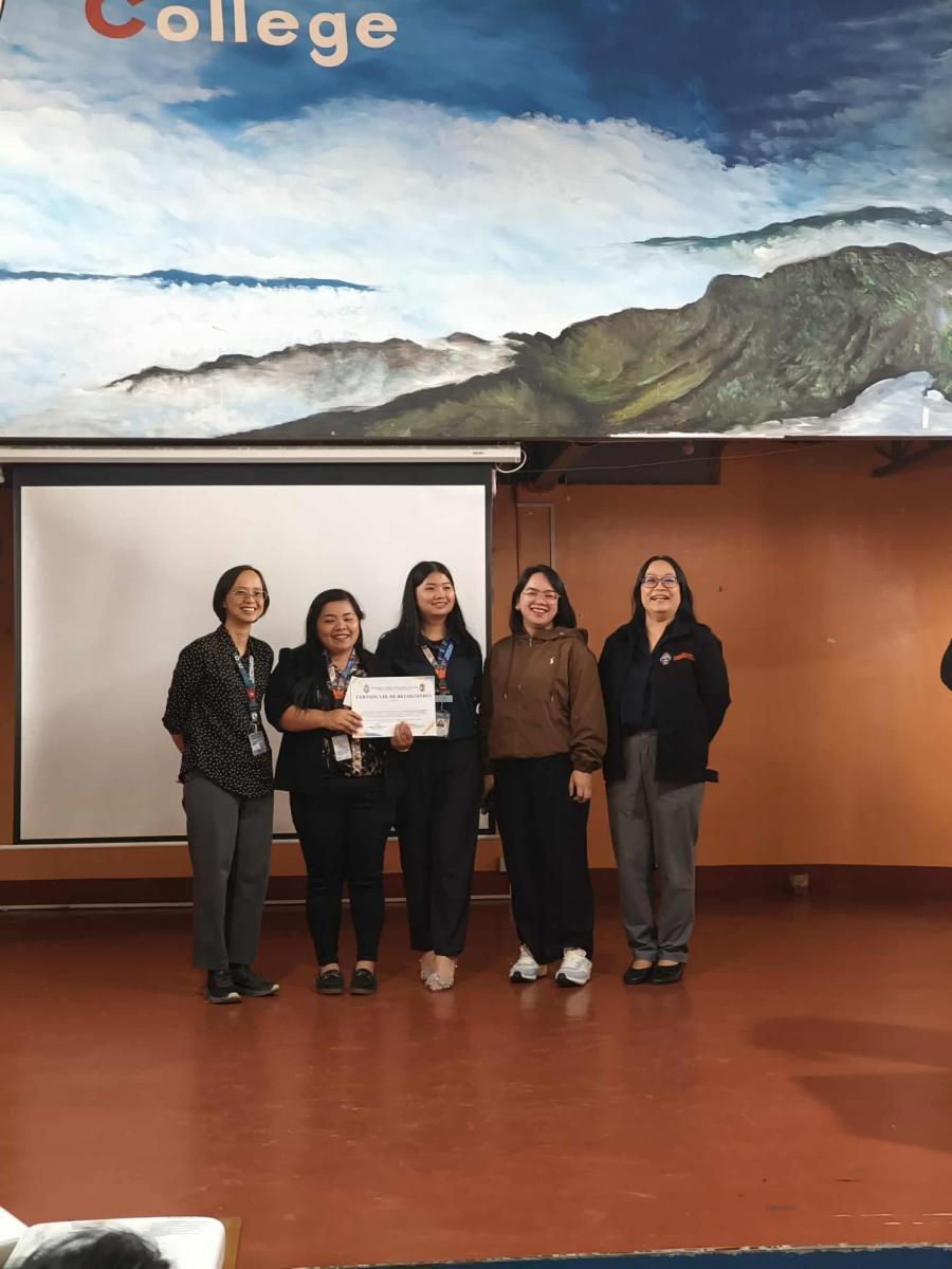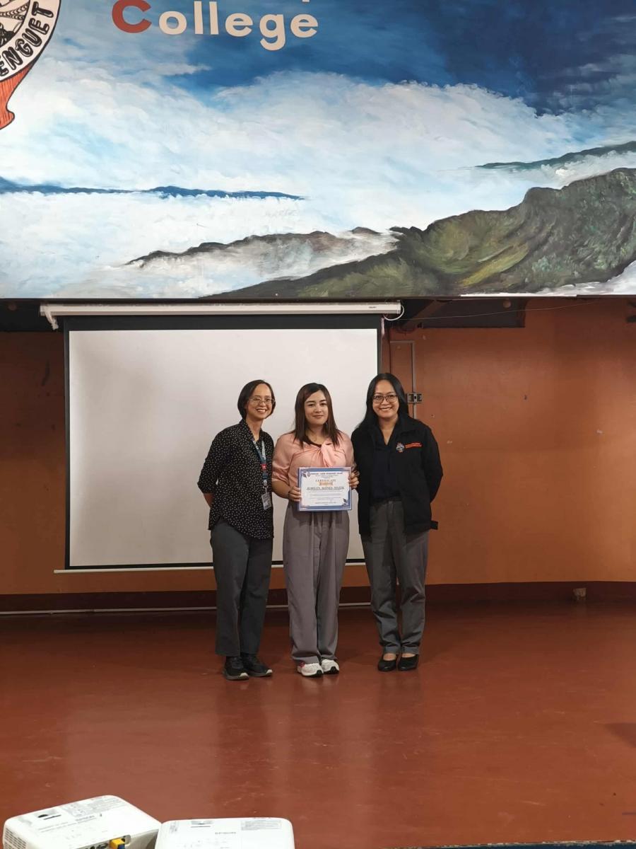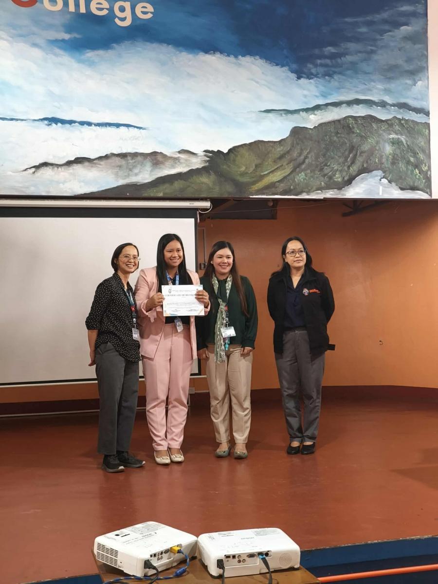 The evaluative panel guiding the event comprised distinguished external scholars: Michael Sebullen, CRS, PhD (Research Director, Baguio Central University), Jessica Balag-ey, MAEd (Research Development and Extension Director, Easter College), and Judelyn Alones, MA ESL (Instructor, Benguet State University). They offered insightful commentary, evaluating alignment to community needs, methodological rigor, presentation clarity, and potential impact. Certificates of appreciation were presented to the panel by Atty. Annabelle B. Gondales (Vice President for Administration) and Sherry Junette M. Tagle, PhD (President).